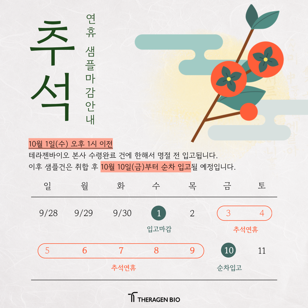 [테라젠바이오] 추석연휴 샘플 입고 마감 일정안내