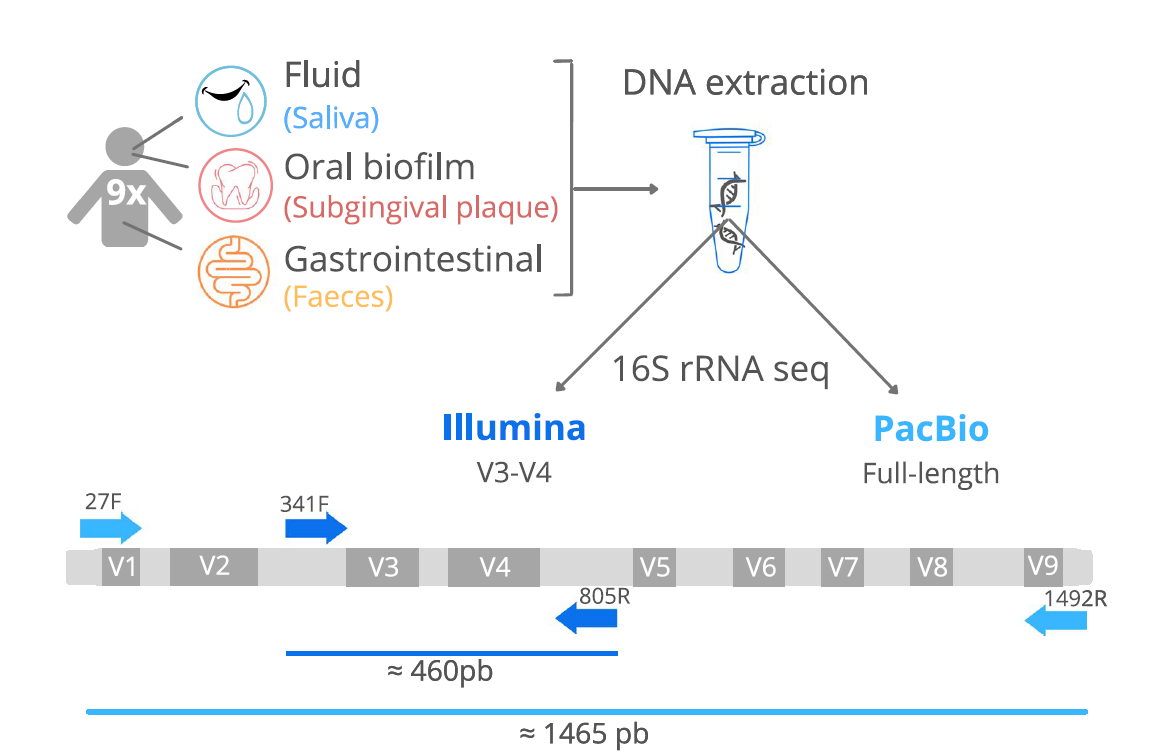 이 연구에서는 사람의 타액, 치주낭 플라크, 대변 샘플을 대상으로 16S V3-V4 Sequencing 과 16S Full Length Sequencing 을 비교 분석했습니다. 그 결과, 16S Full Length 시퀀싱이 16S V3–V4 부분 시퀀싱보다 종(species) 수준의 분류 정확도가 높다는 점을 확인했습니다.